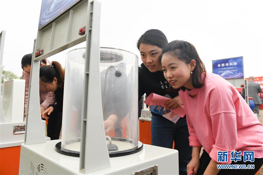 4月23日,当地群众体验流动科普展品。 当日,安徽省肥西县2019年文化科技卫生“三下乡”活动在铭传乡启明社区举行。来自全县文化、科技、卫生等部门的志愿者为村民带来一场文艺演出,并开展义诊、科普等活动。 新华社记者 张端 摄