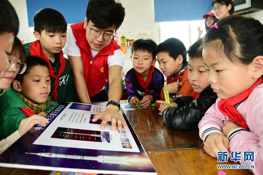 4月23日,江苏省镇江市官塘桥中心小学的学生们在志愿者的带领下学习航天知识。 当日,各地开展形式多样的航天日主题活动,让学生们学习航天知识、探求宇宙奥秘,迎接4月24日“中国航天日”。 新华社发(石玉成 摄)