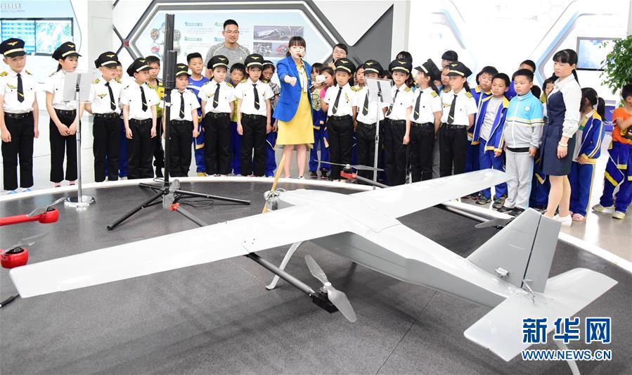 4月23日,浙江省建德市寿昌第二小学的学生们在航空小镇科普展示厅内参观。 当日,各地开展形式多样的航天日主题活动,让学生们学习航天知识、探求宇宙奥秘,迎接4月24日“中国航天日”。 新华社发(宁文武 摄)