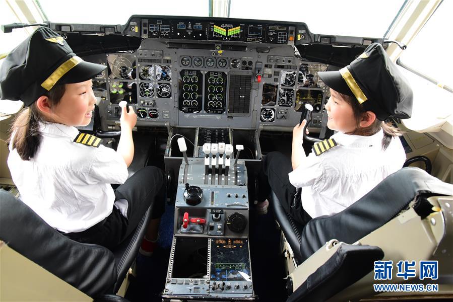 4月23日,浙江省建德市寿昌第二小学的学生在航空小镇科普展示厅内体验模拟驾驶飞机。 当日,各地开展形式多样的航天日主题活动,让学生们学习航天知识、探求宇宙奥秘,迎接4月24日“中国航天日”。 新华社发(宁文武 摄)