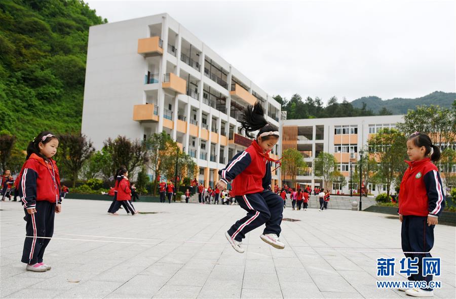 4月22日,贵州省剑河县城关第五小学的学生在跳皮筋。近年来,贵州省黔东南苗族侗族自治州剑河县在开展易地扶贫搬迁工作中,积极在易地扶贫搬迁新区内及周边新建幼儿园、小学、社区卫生服务站、扶贫车间等,让搬迁户及其子女不愁吃、不愁穿,有安全住房,能就近就医、上学、就业,让搬迁户真正能“搬得出、稳得住、能致富”。新华社记者 杨文斌 摄