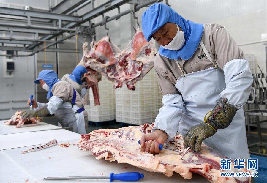 广西河池市都安瑶族自治县在脱贫攻坚产业发展中,建设广西都安西南冷链仓储物流中心,并于2018年6月开始运营。这个中心集屠宰加工、产品展示、电子商务、冷链物流等功能于一体,形成“供、储、展、运、销、配”全产业链条,是都安“贷牛还牛”扶贫产业乃至河池市养殖扶贫产业链的“终点站”,也是从养殖到市场、餐桌的中转枢纽,为当地扶贫产业提供强有力的市场流通保障。 4月23日,在广西都安西南冷链仓储物流中心,工人在切割牛肉。 新华社记者 陆波岸 摄