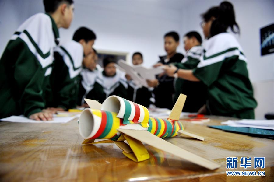 4月24日,河北承德双滦区第三中学学生在老师的带领下用废弃材料制作“航天器模型”。当日是中国航天日。 新华社发(王立群 摄)