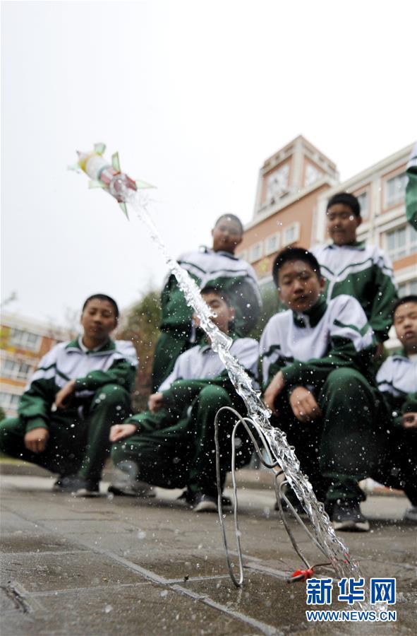 4月24日,河北省承德市双滦区第三中学学生在体验发射水火箭。当日是中国航天日。 新华社发(王立群 摄)