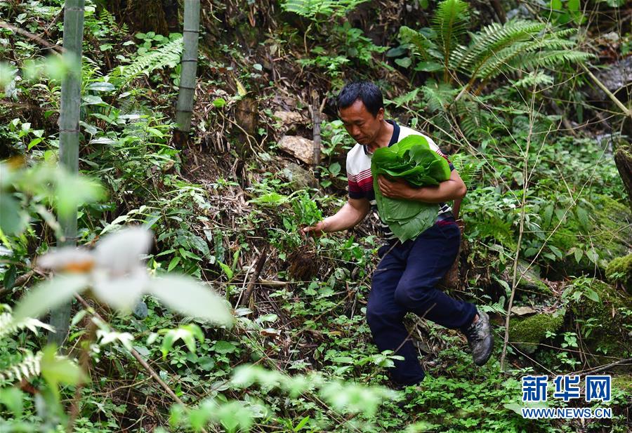 在广西融水苗族自治县杆洞乡尧告村周理屯,2017年脱贫的韦金华在山上采树叶,准备铺在地上当桌布(4月22日摄)。 新华社记者 黄孝邦 摄