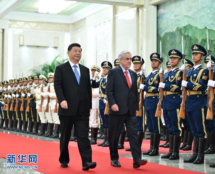 4月24日,国家主席习近平在北京人民大会堂同智利总统皮涅拉举行会谈。这是会谈前,习近平在人民大会堂北大厅为皮涅拉举行欢迎仪式。 新华社记者 殷博古 摄