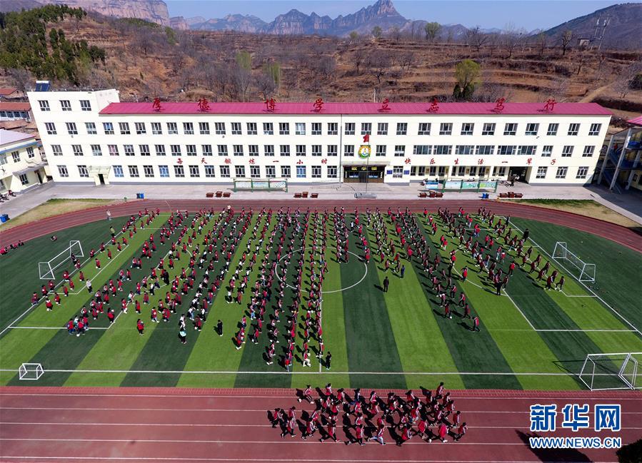 这是学生们在做足球操(4月15日无人机拍摄)。 新华社记者詹彦摄