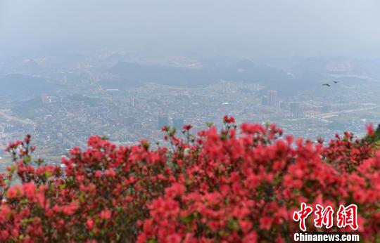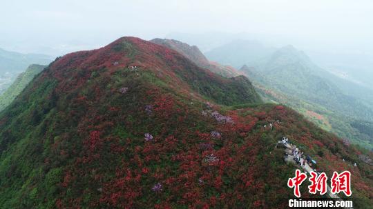 近日,暮春时节,贵州省黔东南苗族侗族自治州丹寨县龙泉山景区的映山红竞相绽放,犹如团团火焰映红了整个山头甚为壮观,吸引众多游客前来赏花观光。