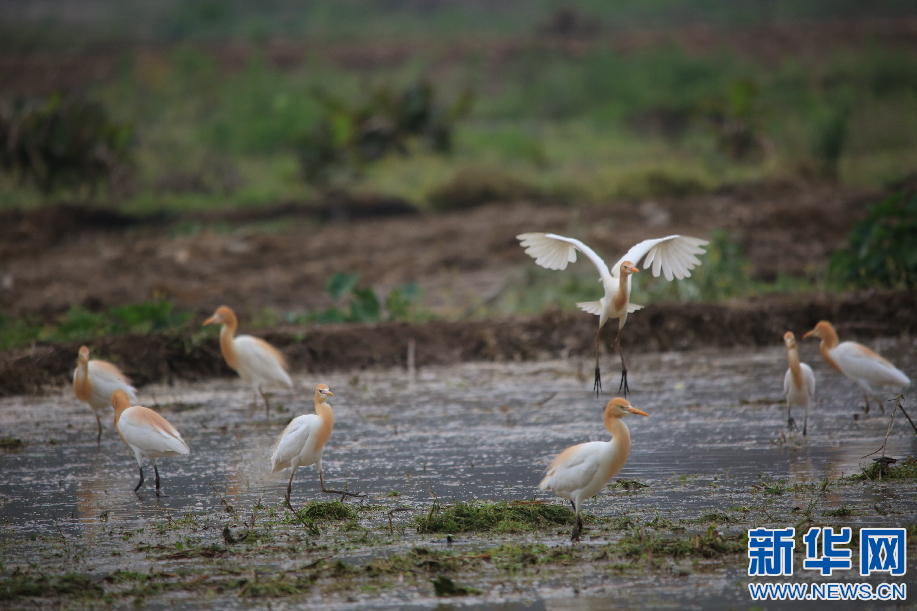 鹭鸟田间觅食。新华网发 李业锦摄