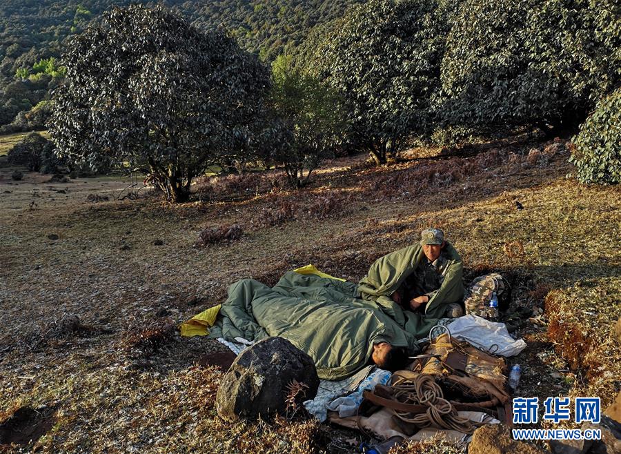 4月24日,护林员杨洪坤和陶洪海在林地里露宿。每年的4月和5月防火压力大。这个时候护林员常常住在山里。 新华社记者 江宏景摄