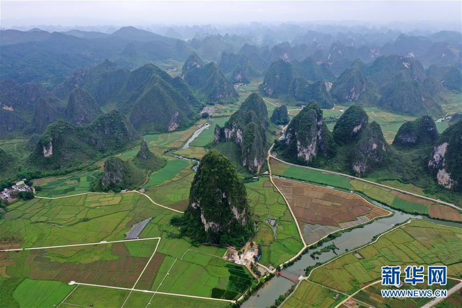这是广西靖西市新靖镇境内的田园风光(4月16日无人机拍摄)。 新华社记者 陆波岸 摄