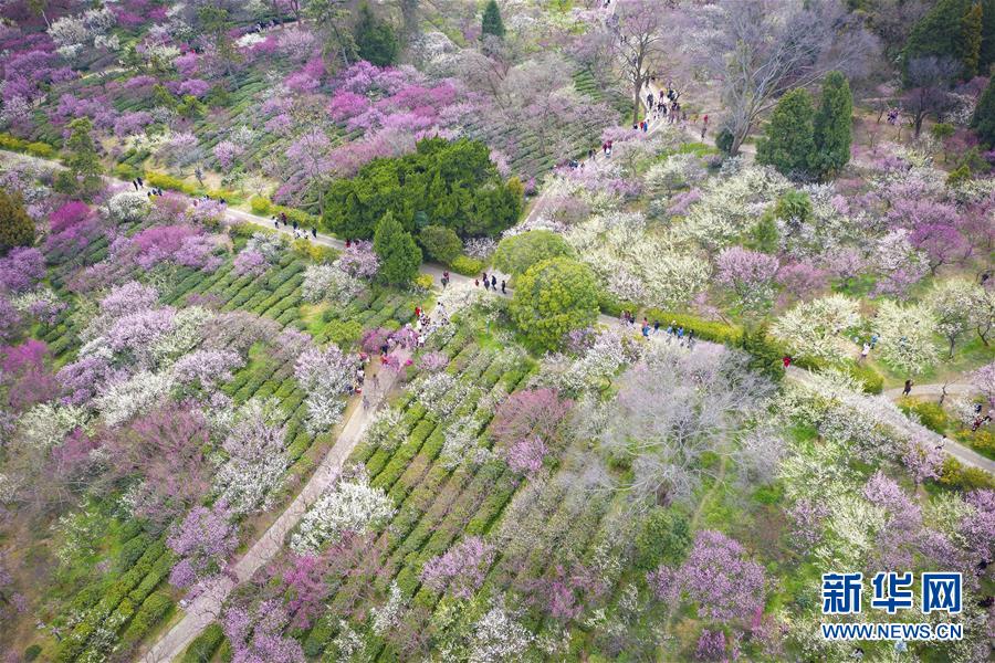 游客在江苏南京梅花山赏花(3月8日无人机拍摄)。 新华社发(苏阳 摄)