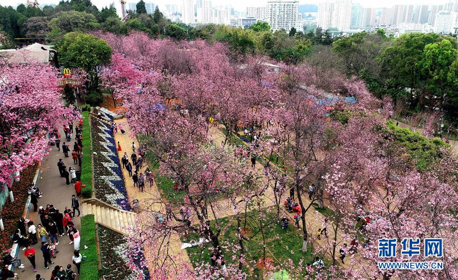 游人在云南昆明圆通山公园观赏盛开的樱花(3月16日无人机拍摄)。 新华社记者 秦晴 摄