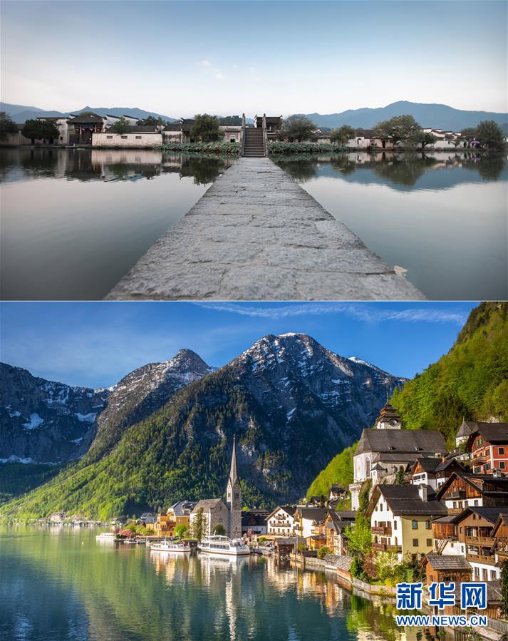 拼版照片:上图为2012年9月26日拍摄的中国安徽宏村的景色,下图为2019年4月25日拍摄的奥地利哈尔施塔特的景色(新华社记者郭晨摄)。