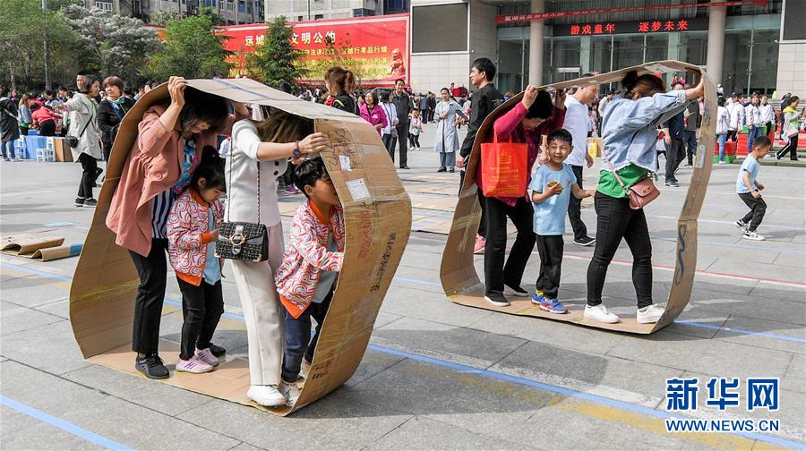 4月26日,运城市盐湖区实验幼儿园的孩子们和家长一起参加“无敌风火轮”比赛。 当日,山西省运城市盐湖区实验幼儿园举办亲子趣味运动会,孩子们和家长老师一起,利用废旧物品制作了各种游戏道具,共同享受运动带来的快乐。 新华社发(薛俊 摄)