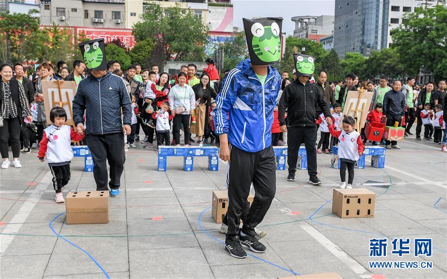 4月26日,运城市盐湖区实验幼儿园的孩子们和家长一起参加“牵着你的手”比赛。 当日,山西省运城市盐湖区实验幼儿园举办亲子趣味运动会,孩子们和家长老师一起,利用废旧物品制作了各种游戏道具,共同享受运动带来的快乐。 新华社发(薛俊 摄)