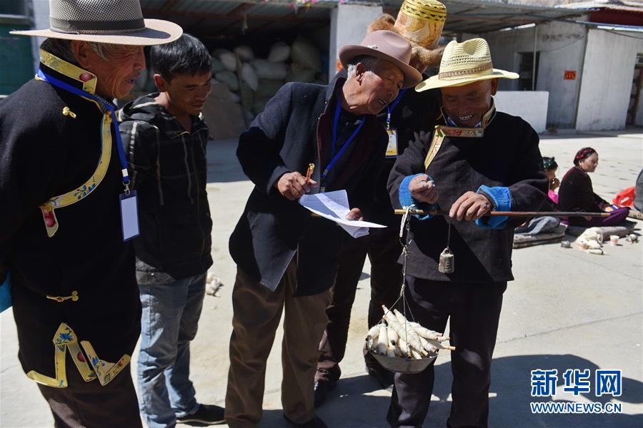 4月26日,氆氇制作技能比赛评委和工作人员正在评估选手捻线成绩。 当日,西藏山南市贡嘎县朗杰学乡岗则村村委会院内举行氆氇制作技能比赛,当地人民以这种方式迎接五一国际劳动节的到来。 新华社记者 周锦帅 摄