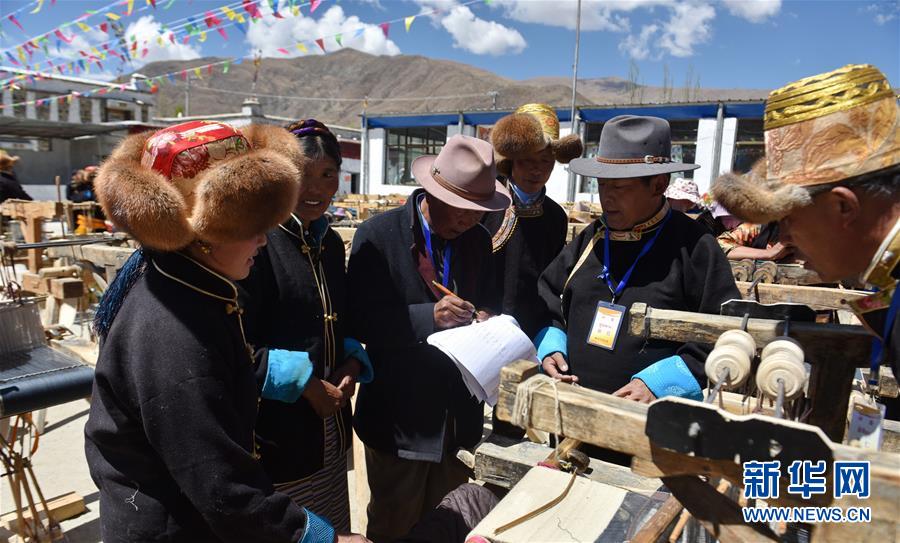 4月26日,氆氇制作技能比赛评委和工作人员正在评估选手氆氇编织成绩。 当日,西藏山南市贡嘎县朗杰学乡岗则村村委会院内举行氆氇制作技能比赛,当地人民以这种方式迎接五一国际劳动节的到来。 新华社记者 周锦帅 摄