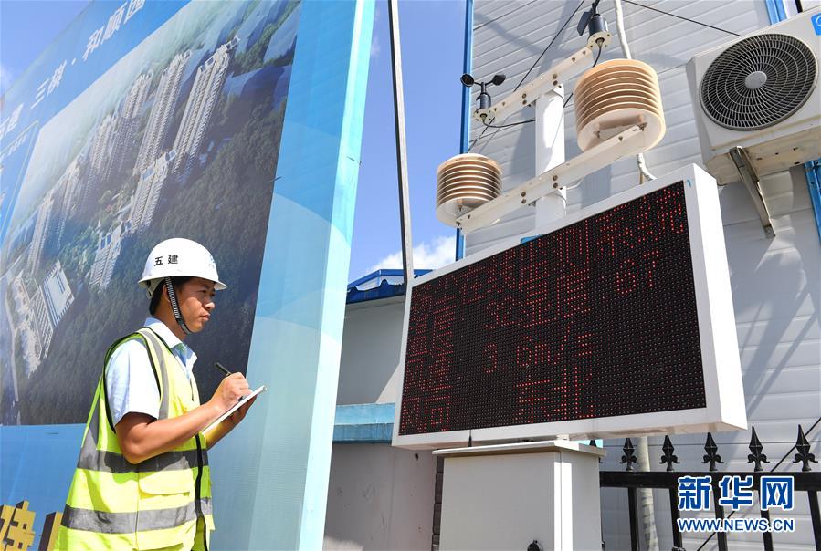 在广西南宁市一处建设工地,工作人员在查看安装在工地的扬尘在线监测系统有关数据(2018年5月25日摄)。新华社记者 陆波岸 摄
