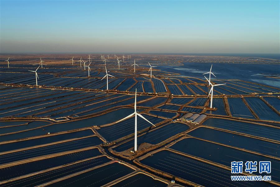 这是河北省唐山市乐亭县姜各庄镇海边养殖区内的风电场(2018年11月10日无人机拍摄)。新华社记者 杨世尧 摄