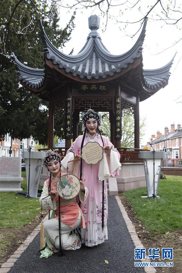 4月26日,在英国埃文河畔斯特拉特福镇,来自中国的演员站在牡丹亭前。 在英国文学巨匠莎士比亚诞辰455周年之际,一座依托中国明代文学家、戏曲家汤显祖代表作《牡丹亭》而建的牡丹亭26日在莎翁故里落成揭幕,成为中英两国联合纪念这两位同时代文豪、促进东西方文化互鉴的又一标志性建筑物。这座牡丹亭坐落在莎翁故里斯特拉特福镇罗瑟街的绿地花园内,距离莎翁诞生地步行仅约10分钟,是中国首座落户海外的牡丹亭。 新华社发(雷伊·唐摄)