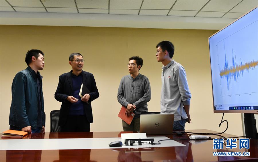 在国家超级计算天津中心,孟祥飞(左二)在和同事一起分析数据信息(4月24日摄)。新华社记者李然摄