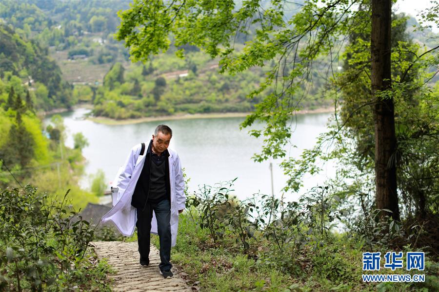 雍元书医生走在出诊的山路上(4月12日摄)。 贵州省湄潭县复兴镇湄江湖村乡村医生雍元书坚守山区51年,服务五代湄江湖人,他的足迹遍布每一条山间小道。如今,71岁的雍元书为了村民健康,每天仍背着出诊箱奔走山间。 新华社记者 刘续 摄
