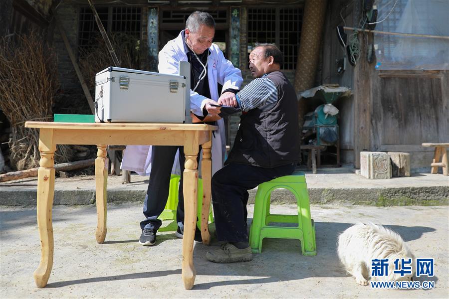 雍元书医生在为村里一名老人看病(4月12日摄)。 贵州省湄潭县复兴镇湄江湖村乡村医生雍元书坚守山区51年,服务五代湄江湖人,他的足迹遍布每一条山间小道。如今,71岁的雍元书为了村民健康,每天仍背着出诊箱奔走山间。 新华社记者 刘续 摄