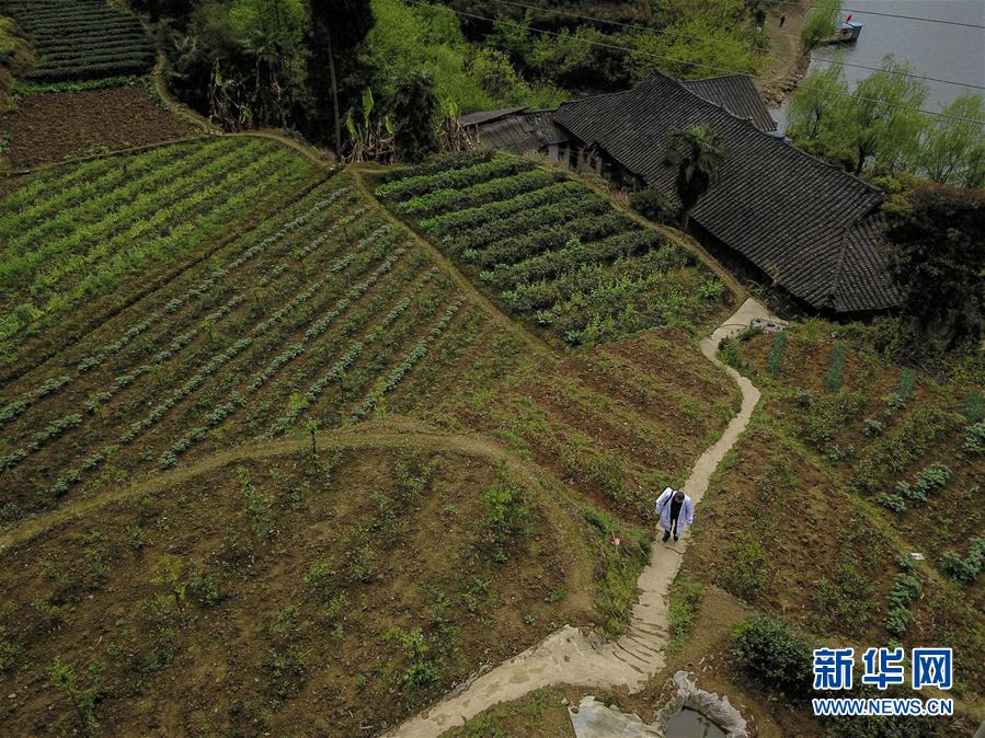 雍元书医生走在出诊的路上(4月12日无人机拍摄)。 贵州省湄潭县复兴镇湄江湖村乡村医生雍元书坚守山区51年,服务五代湄江湖人,他的足迹遍布每一条山间小道。如今,71岁的雍元书为了村民健康,每天仍背着出诊箱奔走山间。 新华社记者 刘续 摄