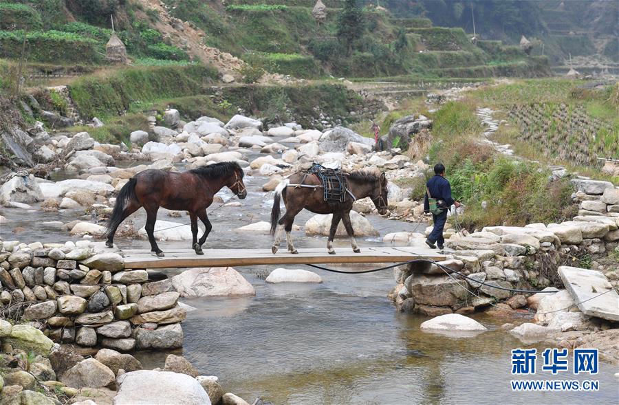 在黔桂乌英苗寨,村民牵马上山劳作(2017年11月10日摄)。 新华社记者 黄孝邦 摄