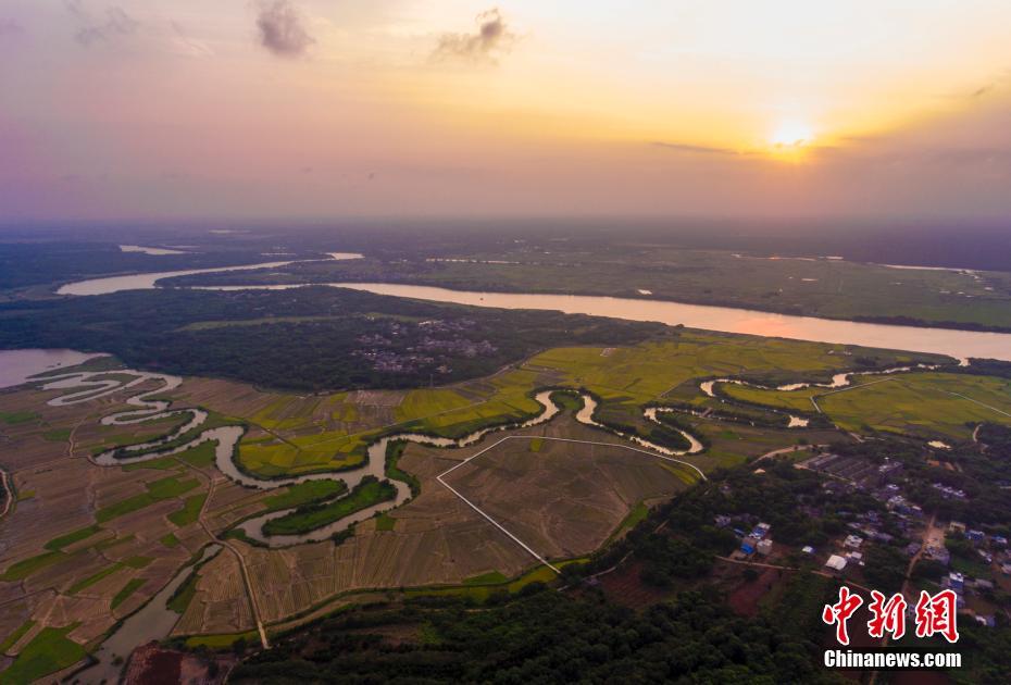 航拍海口三十六曲溪湿地 犹如巨龙漫舞稻田间