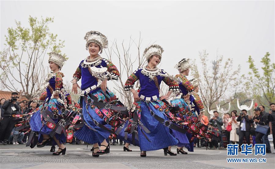 4月29日,在北京世园会中华园艺展示区中的贵州园,工作人员表演舞蹈。 当日,2019年中国北京世界园艺博览会开园。 新华社记者 才扬 摄