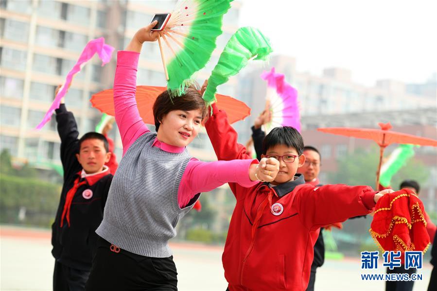 4月29日,在石家庄市第四十四中学,舞蹈老师指导学生练习井陉拉花。 近年来,河北省石家庄市第四十四中学将井陉拉花等非遗项目引进校园,并结合现代音乐改编为课间操,让学生们在强身健体的同时学习传承传统非遗文化。井陉拉花属北方秧歌,历史悠久,已被列入第一批国家级非物质文化遗产名录。 新华社发(许建园 摄)