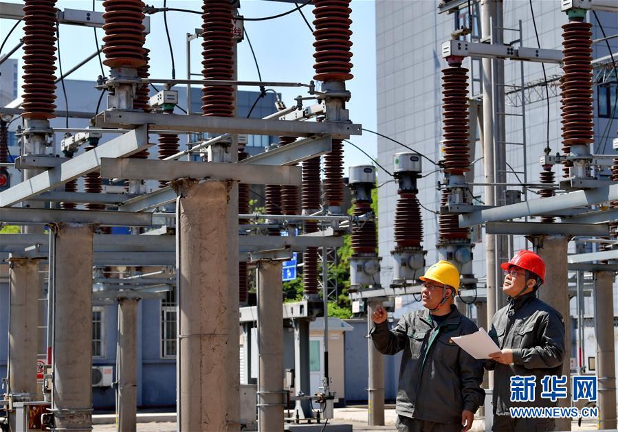 李征(左)和同事在一座变电站内巡视(4月26日摄)。 新华社记者 杨世尧 摄