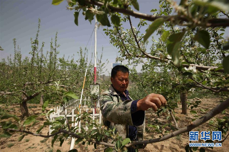 延安安塞区方塔村果农王喜平在查看苹果树的坐果情况,身后为果园里的自动气象站(4月25日摄)。 新华社记者 刘诗平 摄