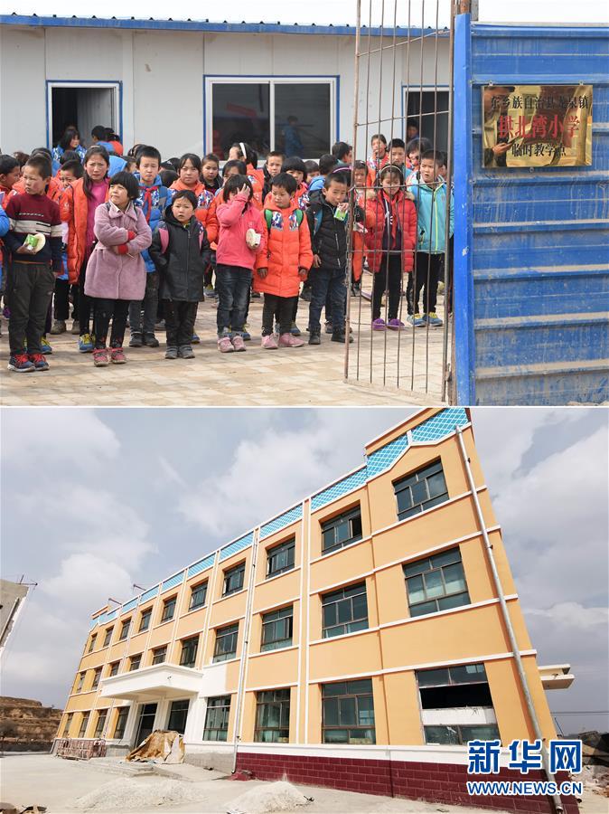 拼版照片:上图为东乡族自治县龙泉镇拱北湾小学临时教学点;下图为东乡族自治县龙泉镇拱北湾小学在建教学楼(3月5日摄)。 “全国脱贫看甘肃,甘肃脱贫看临夏,临夏脱贫看东乡。”甘肃省临夏回族自治州东乡族自治县,是全国唯一以东乡族为主体的县,属于“三区三州”深度贫困地区,堪称“贫中之贫,困中之困”。记者最近两次深入东乡的六大山梁、六条深沟采访,既深切体会到此地贫困深度与脱贫难度,也深切体会到干部群众打赢脱贫攻坚战的信心与决心。 新华社记者 范培珅 摄