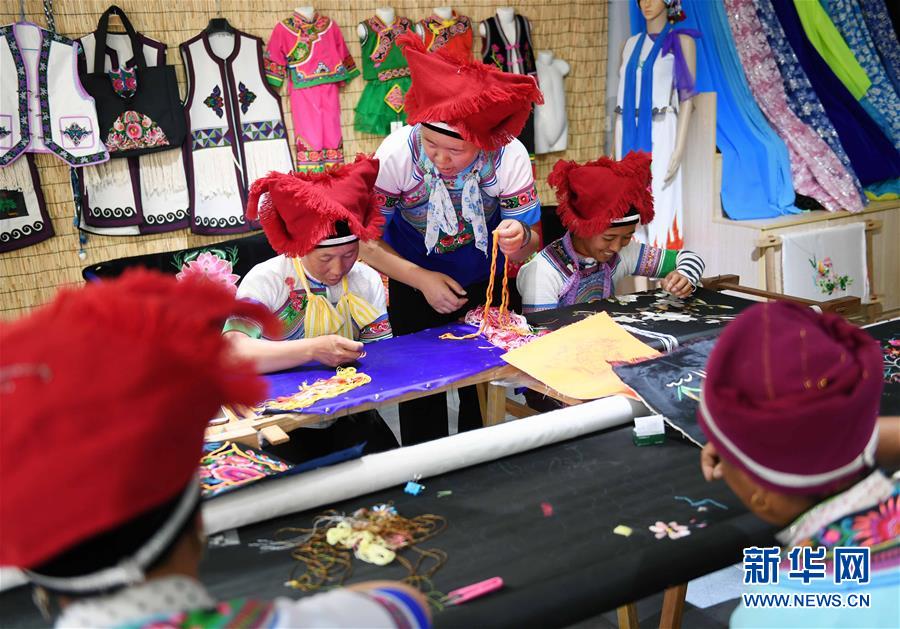 4月26日,王陆芬(中)在位于白沙坡村的刺绣车间查看彝族绣娘的绣品。 2014年,云南省文山壮族苗族自治州砚山县维摩乡白沙坡村彝族绣娘王陆芬在当地政府和相关部门的扶持帮助下,创建“砚山县纸艺刺绣农民专业合作社”,吸收周边1000多名各族妇女从事刺绣产业,产品远销北京、上海、广州等地,助力当地群众脱贫增收。 新华社记者 杨宗友 摄