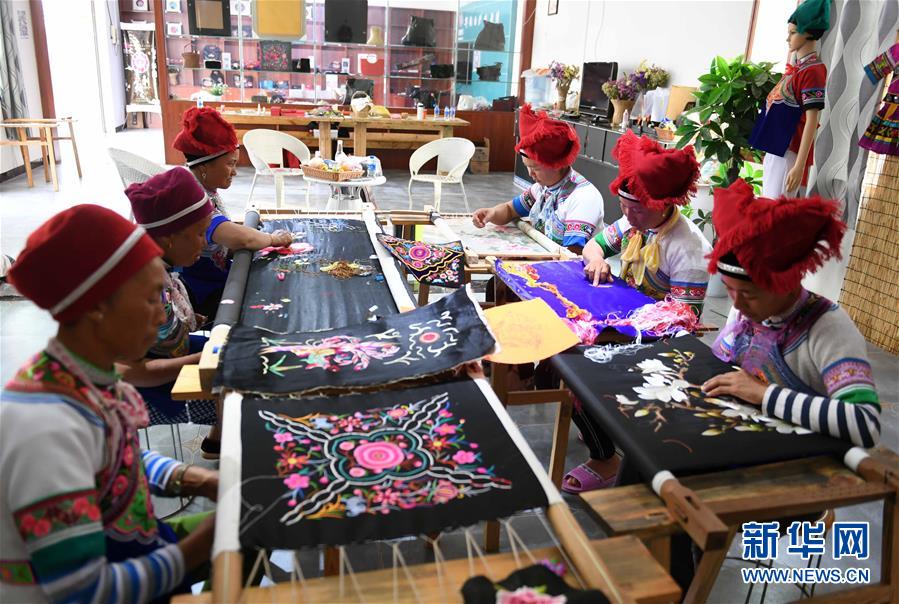 4月26日,绣娘们在位于白沙坡村的刺绣车间忙碌。 2014年,云南省文山壮族苗族自治州砚山县维摩乡白沙坡村彝族绣娘王陆芬在当地政府和相关部门的扶持帮助下,创建“砚山县纸艺刺绣农民专业合作社”,吸收周边1000多名各族妇女从事刺绣产业,产品远销北京、上海、广州等地,助力当地群众脱贫增收。 新华社记者 杨宗友 摄