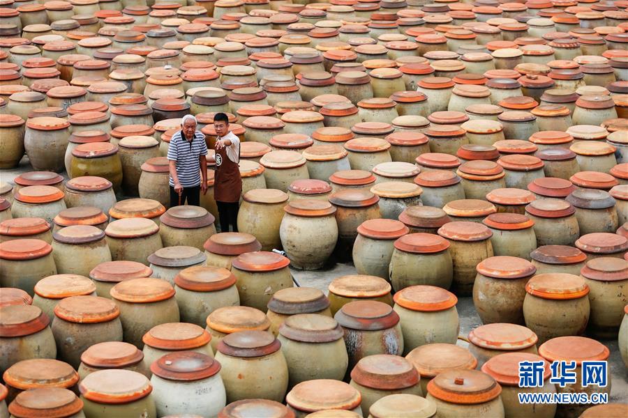 4月29日,在福建省泉州市晋江闽古食品有限公司,吴华清(右)和吴宗洲在酱油晒场巡查。 新华社发(赖进财摄)