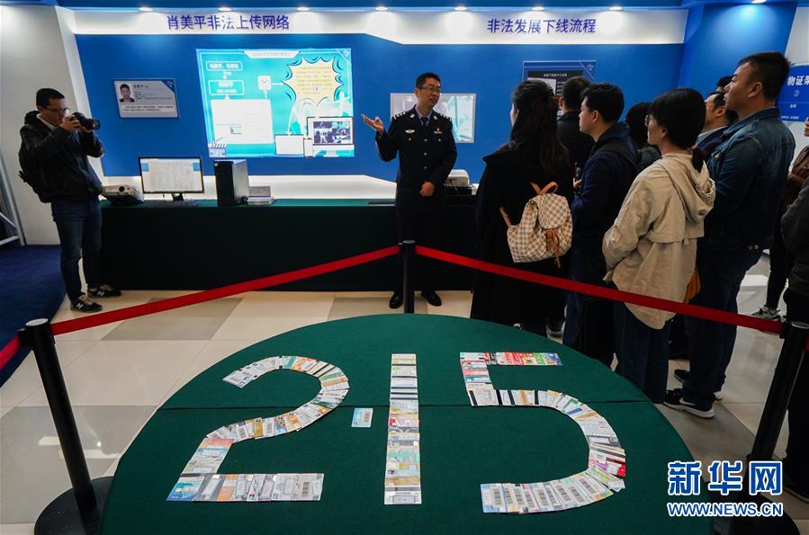 4月29日,办案民警在“天网擒幽”——公安部“2·15”系列侵犯著作权案侦查纪实展览现场介绍案件侦破历程。“天网擒幽”展览通过大量图片、实物和视频展览,全面展示“2·15”系列专案的侦破历程。新华社记者 李响 摄