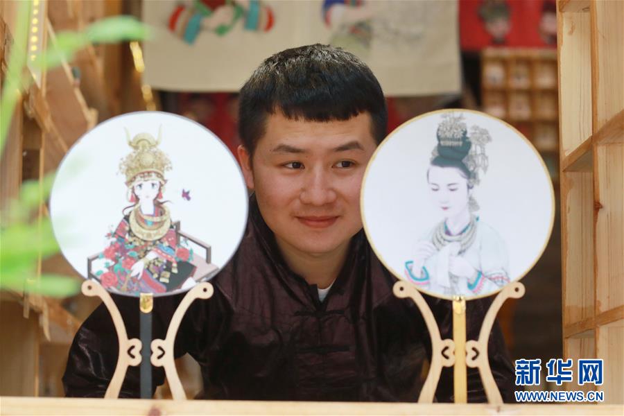 2019年4月16日,在贵州黎平,兰才生在插画馆内查看根据自己插画作品制作的扇面。“90后”侗族青年兰才生2015年大学毕业后回到家乡贵州黎平,在肇兴侗寨内创立“兰才生插画馆”,以苗族侗族的少数民族文化为主题创作插画,开发衍生文创产品。画风细腻的艺术插画在当地小有名气,受到海内外游客的肯定。“以插画的形式,让贵州的少数民族文化被更多人喜欢和了解是我最大的心愿。”兰才生说。 青年兴则国家兴,青年强则国家强。在我国广袤的土地上,激扬着热情与活力的青年们正以蓬勃向上之力,在平凡的岗位中挥洒着汗水,在自我奉献中展现人生价值。 新华社记者 欧东衢 摄