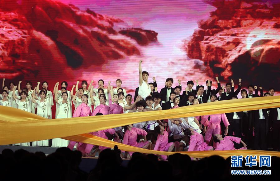 4月29日,上海财经大学和上海戏剧学院的学生表演歌舞《保卫黄河》。 4月29日晚,以“青春心向党,建功新时代”为主题的“上海青少年纪念五四运动100周年主题歌会”在上海大学生体育中心举行,来自全市多所高校、中小学的近6000名团员青年、少先队员参加歌会。 新华社记者 刘颖 摄