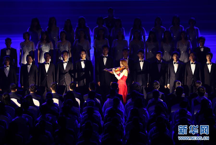 4月29日,上海交通大学的学生在表演合唱《我的祖国》。 4月29日晚,以“青春心向党,建功新时代”为主题的“上海青少年纪念五四运动100周年主题歌会”在上海大学生体育中心举行,来自全市多所高校、中小学的近6000名团员青年、少先队员参加歌会。 新华社记者 刘颖 摄
