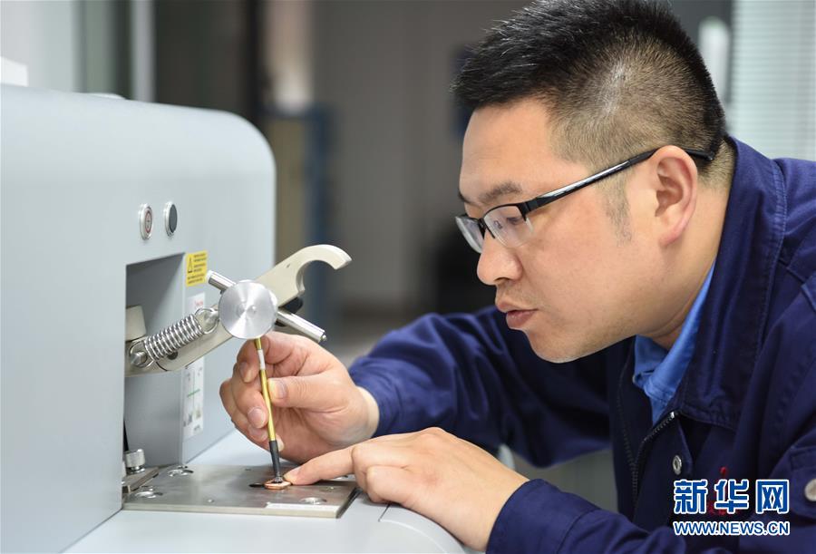 4月25日,在安徽铜陵精达特种电磁线股份有限公司技术中心实验室,苏保信开展特种电磁线技术攻关。 新华社发(过仕宁 摄)