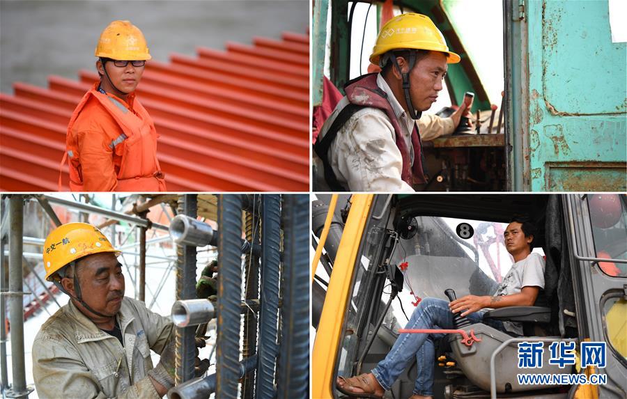 拼版照片:左上图为焊工王长江,27岁,湖北黄石人(4月25日摄);右上图为钻机工牟方伟,46岁,湖北恩施人(4月25日摄)。左下图为钢筋工武永财,52岁,辽宁阜新人(4月26日摄);右下图为挖机司机李国贵,30岁,云南曲靖人(4月25日摄)。 新华社记者 邓华 摄