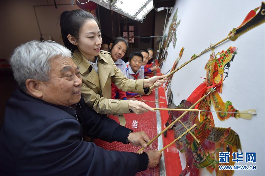 4月30日,唐山市胜利路小学的师生在皮影艺人的指导下学习皮影表演。当日,河北省唐山市胜利路小学的师生来到唐山皮影主题乐园,现场观看皮影戏,体验皮影制作和表演,感受非遗文化魅力。 新华社发(董军 摄)