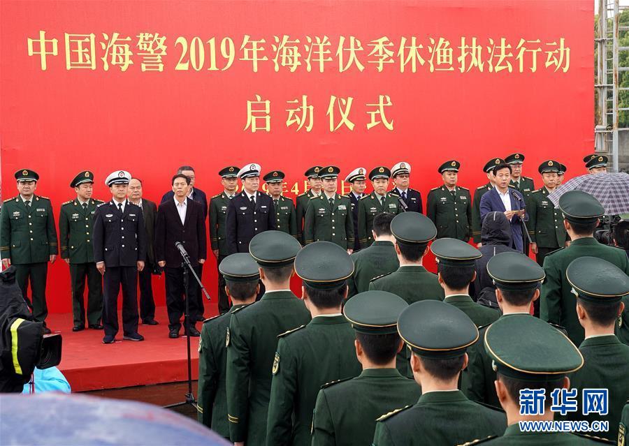 4月30日,2019年海洋伏季休渔执法行动启动仪式在上海举行。 当日,中国海警局东海分局在上海举行“中国海警2019年海洋伏季休渔执法行动启动仪式”,多艘海警执法舰艇鸣笛启航前往预定海域执法。据悉,今年东海区伏季休渔时间为5月1日至9月16日。 新华社记者 陈飞 摄