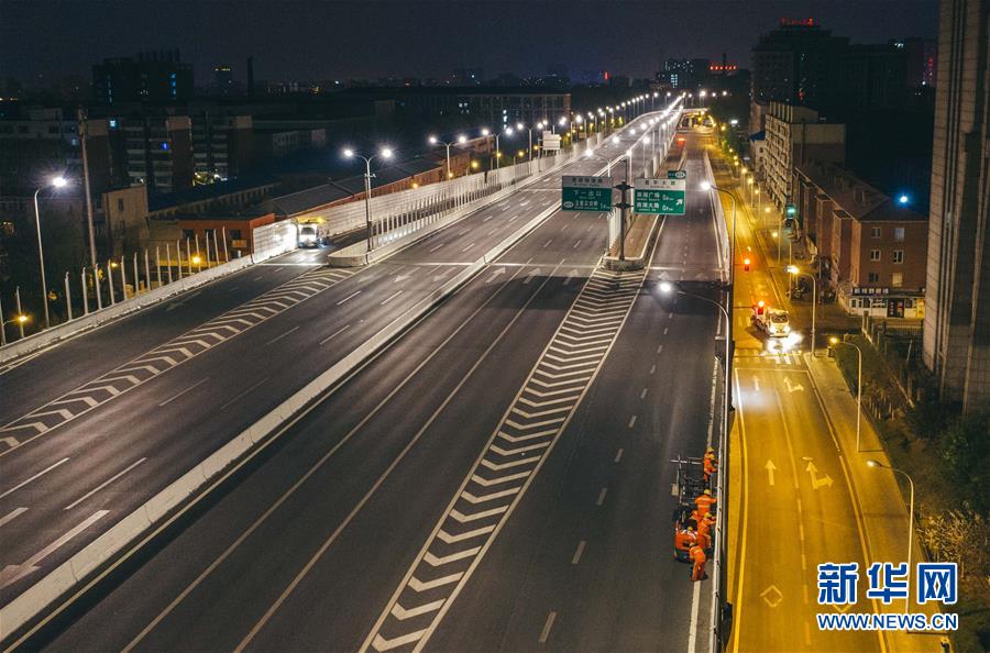 凌晨,长春市市政维护工人在长春市西部快速路上进行隔音带清洗养护作业。在对向车道和快速路桥下道路,两台环卫清洁车在进行路面清洁作业(4月29日摄)。 新华社记者许畅摄