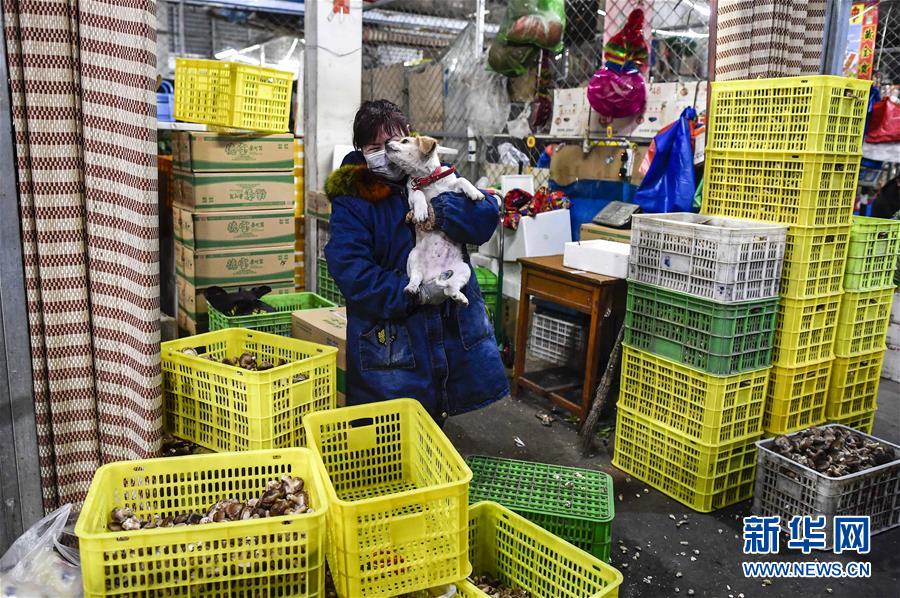 凌晨2点半,在长春市干鲜菜蔬菜批发市场,菌类批发商隋丽娟在摊位前抱着她的小狗(4月25日摄)。 新华社记者许畅摄