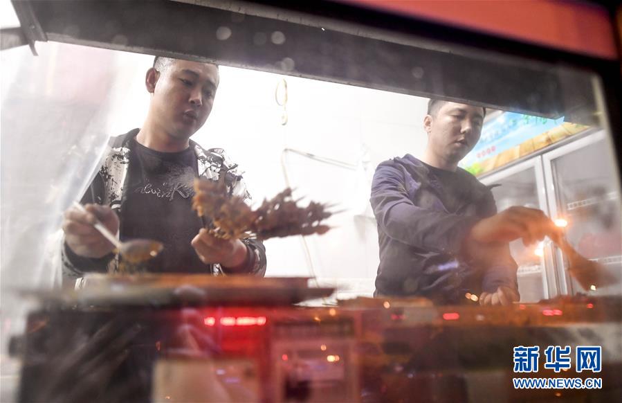 凌晨1点半,在长春市街头一家夜间餐厅,厨师在为来此吃饭的人们制作烤串(4月25日摄)。 新华社记者许畅摄